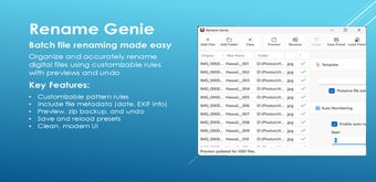 Rename Genie est un utilitaire puissant pour renommer efficacement des fichiers par lots avec des modèles personnalisables, un support pour les métadonnées, des aperçus et des sauvegardes ZIP. Il offre une annulation à un seul niveau et des préréglages configurables pour les tâches répétées. Bien que la version gratuite limite la taille des lots, l'application reste un outil convivial et économiseur de temps pour organiser des photos, des documents et d'autres fichiers.